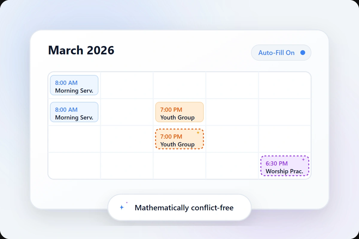 It isn’t just a calendar; it’s an intelligent assistant that understands how churches operate. Just tell the AI what you need in plain English, and watch it build flawless, conflict-free rosters in seconds. It learns your congregation, ensures fair rotations, and handles the heavy lifting so you don’t have to.