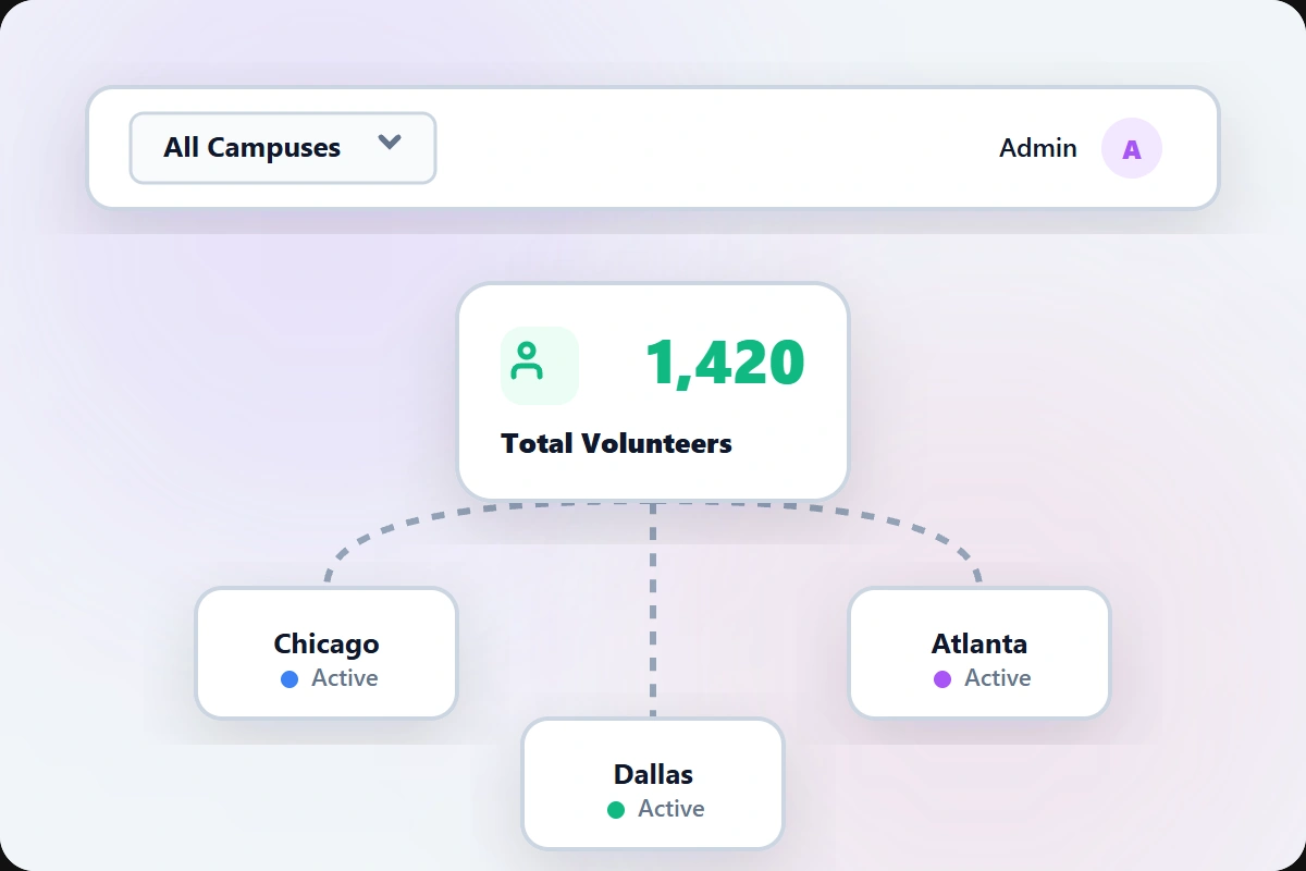 Yes. The platform was built from the ground up to scale. Whether you have one location or five, you can manage multiple branches, share volunteer pools, and set specific granular permissions for different campus leaders—all under one unified billing all from a single organizational dashboard.