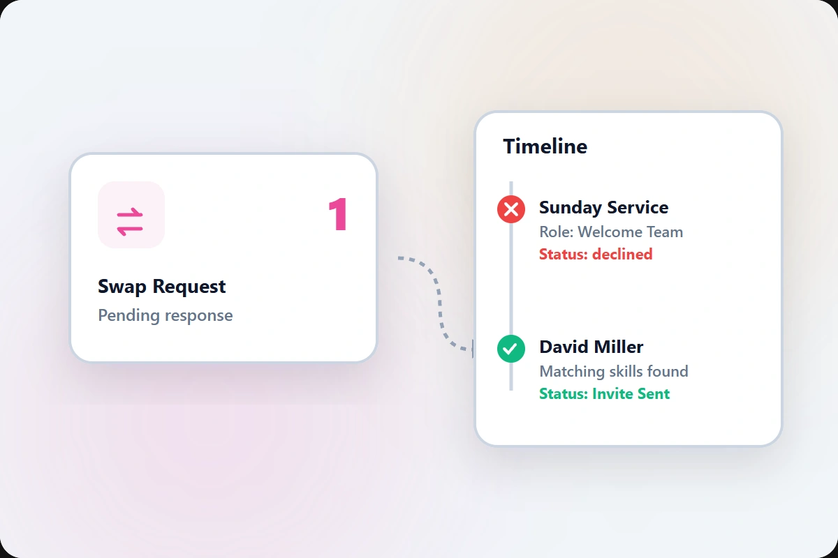 Last-minute cancellations are handled automatically. The system instantly scans for matching skills to invite the next best person.
